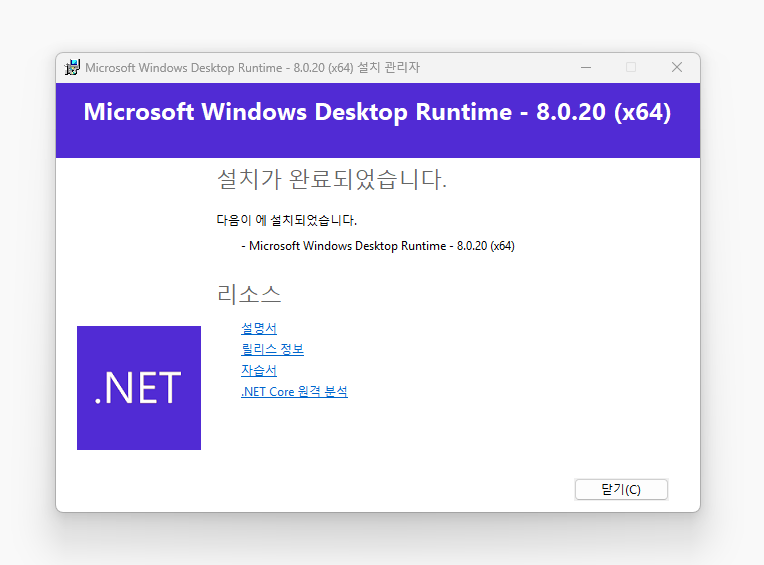 6. 설치가 완료되면 시스템을 재부팅해야 할 수도 있습니다. 재부팅 후 .NET 데스크톱 런타임이 정상적으로 설치되었는지 확인합니다. (명령 프롬프트에서 `dotnet –info` 명령어를 입력하여 확인할 수 있습니다.)